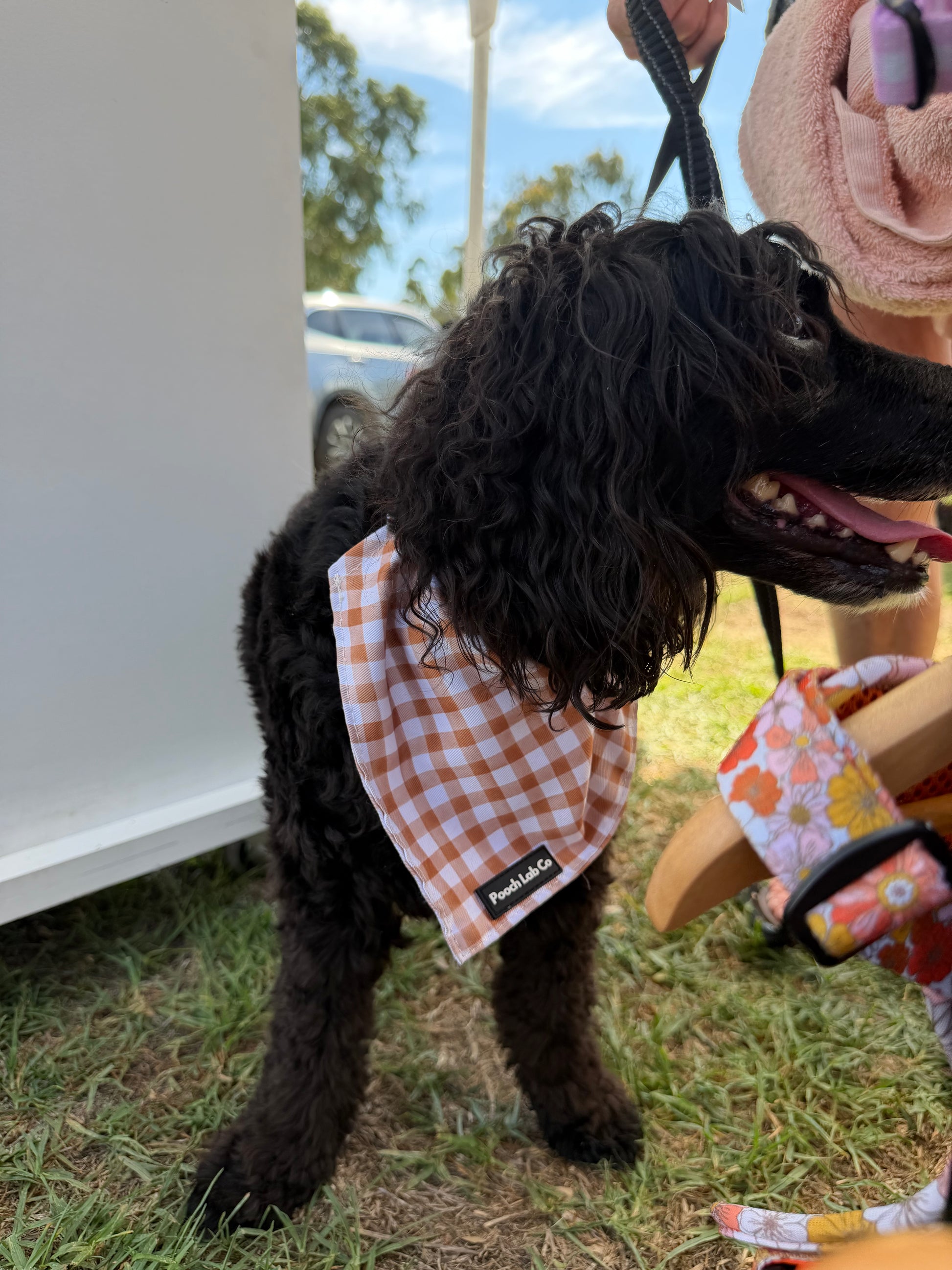 Designed for stylish dogs who love to stand out, this bandana features a classic mocha gingham print with a fresh, modern twist. The soft yet durable fabric makes it perfect for everyday wear — whether your pup is heading to brunch, the park, or striking a pose for their next photo op.